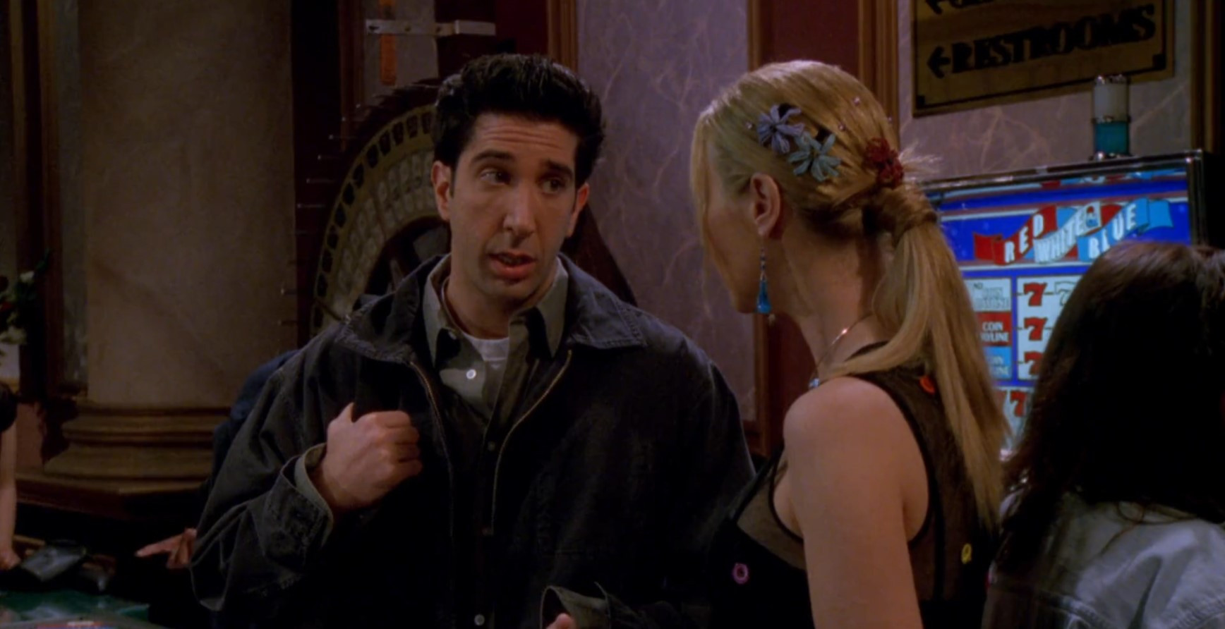 5 сезон 24 серия сериала «Друзья» Фиби и Джо выгоняют из казино. Росс разрисовывает спящей Рэйчел лицо. Чендлер и Моника решают пожениться и идут в часовню. Там они встречают только что поженившихся пьяных Рэйчел и Росса.